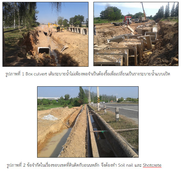 • พื้นที่ Open Channel มีข้อจำกัดเรื่อง Right of way เนื่องจากด้านหนึ่งอยู่ติดถนนหลักของนิคมฯ และอีกด้านหนึ่งอยู่ติดที่ชาวบ้าน ทางบริษัทฯได้เสนอเทคนิคในการทำ Soil nail และ Shotcrete
