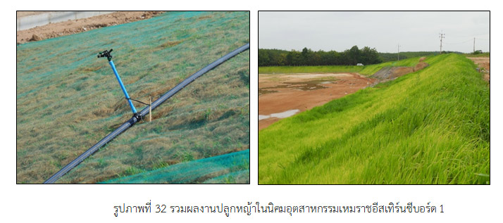 ในช่วงเริ่มต้นของการพัฒนาที่ดิน ได้ใช้การปลูกหญ้านวลน้อยตามลาดเอียง (Slope) ในบริเวณที่อยู่ติดถนน เพื่อความเป็นระเบียบเรียบร้อยและสวยงาม ส่วนบริเวณด้ายท้ายแปลงที่ติดพื้นที่ Green Area ใช้วิธีการพ่นเมล็ดหญ้า (Hydro seeding) ซึ่งต่อมาพบว่าไม่ได้ผลเท่าที่ควร เนื่องจากปัญหาประการหนึ่งก็คือเปอร์เซ็นต์การงอกของเมล็ดหญ้าต่ำ เพราะขาดดินและน้ำที่เป็นองค์ประกอบสำคัญ ทางบริษัทฯ จึงได้เสนอแนวทางหว่านเมล็ดหญ้าและใช้วัสดุชีวภาพ (Biomat) เช่น ใยมะพร้าว ฟางข้าว ขึงตาข่ายป้องกันนก (Anti-Bird Net) และยึดด้วยหมุดอีกทุกระยะ 1 เมตร พร้อมติดตั้งระบบรดน้ำโดยมีขั้นตอนดังนี้